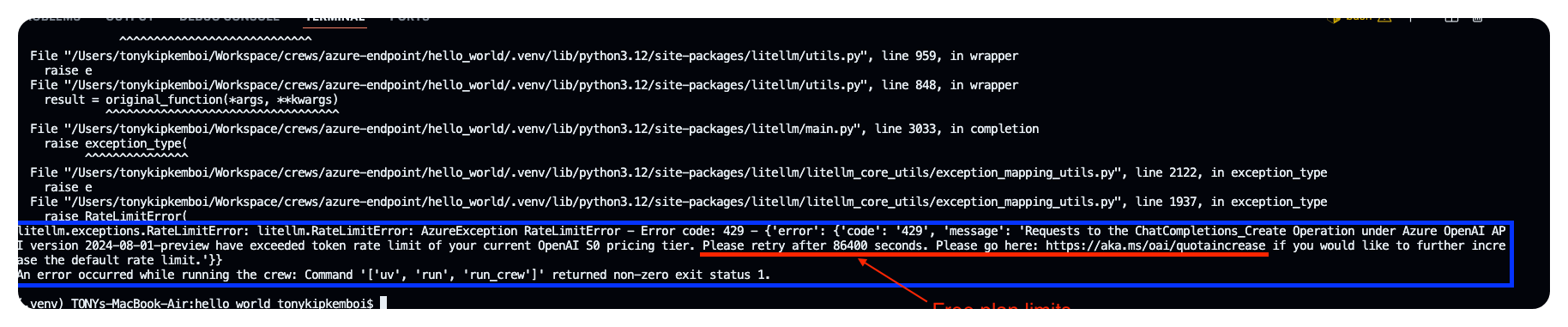 RateLimitErrorwith errorcode 429, it indicates that your requests have exceeded the token rate limit of your current Azure OpenAI pricing tier. To resolve this, consider requesting a quota increase. If your application's requirements exceed the current limits, you can request a quota increase through the Azure portal. Visit https://aka.ms/oai/quotaincrease for more information.