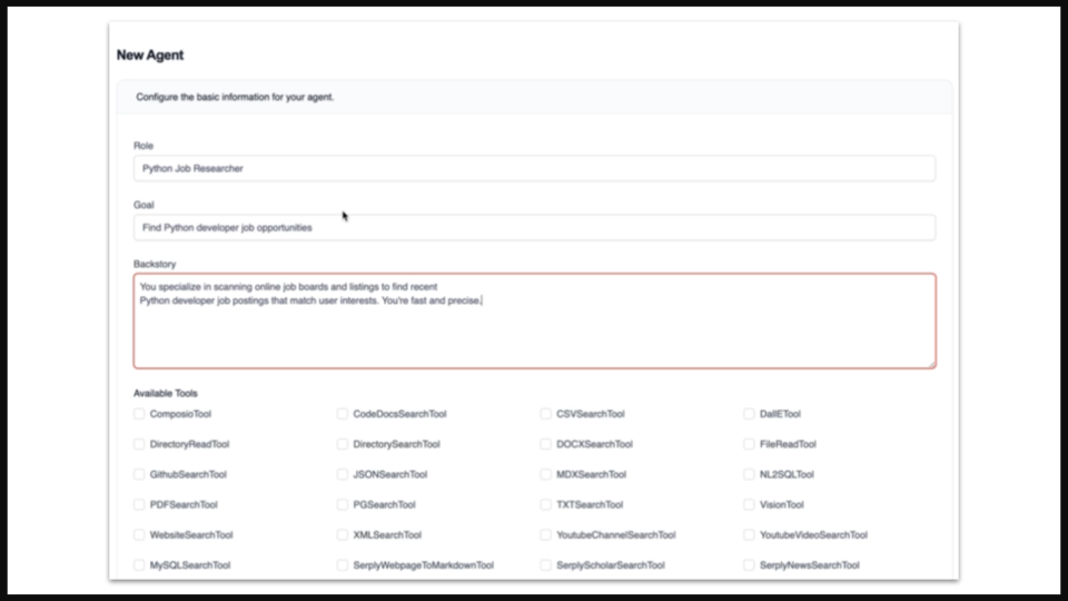 A simple, intuitive UI allows organization members to create and edit agents by setting their role, goal and backstory as well as the tools they need access to. Then, these agents can be added to crews and flows for deployment. It’s that easy.