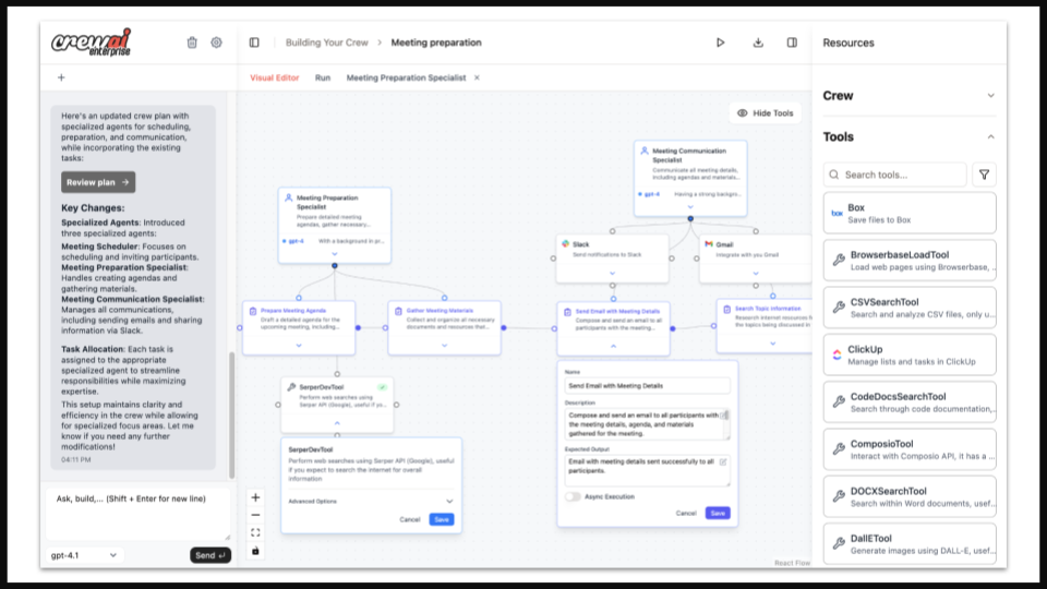 - Canvas with drag-and-drop agents, tools and tasks