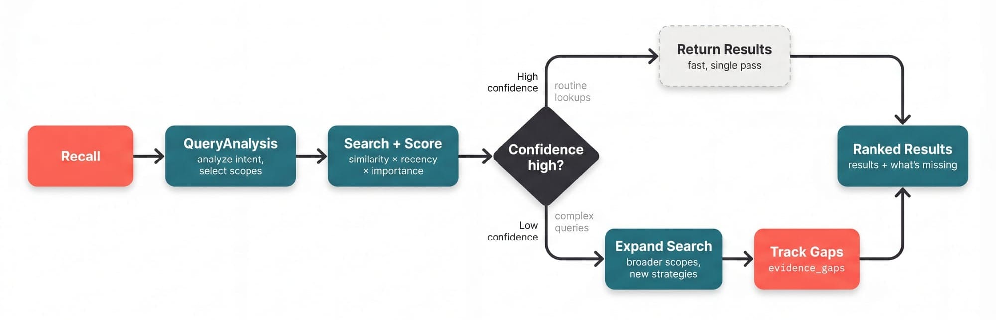 recall() doesn't just search, it evaluates its own confidence and goes deeper when it's not sure.