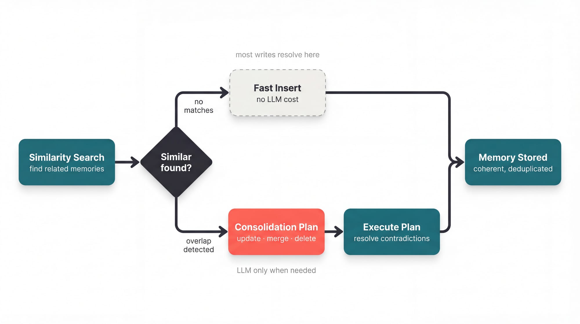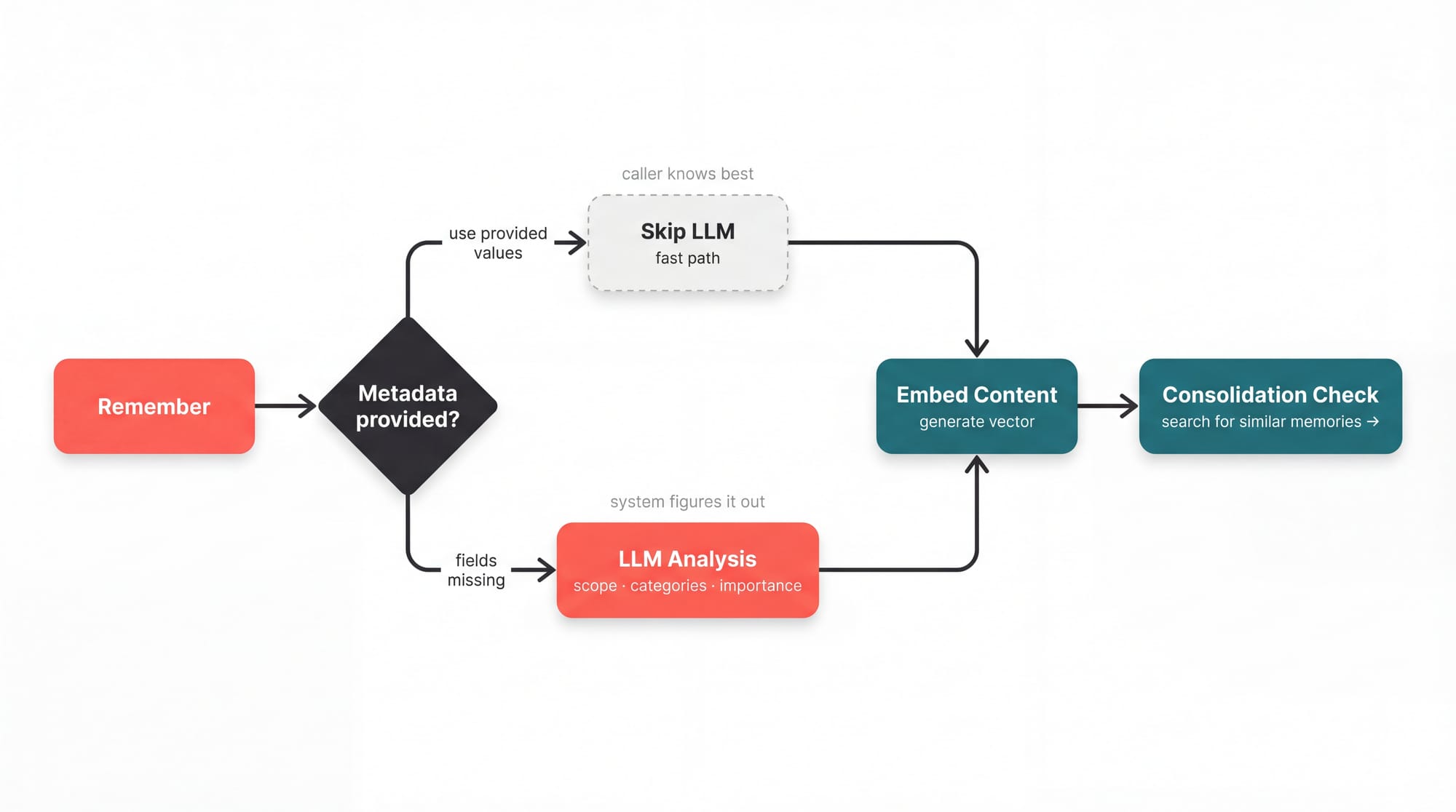 In this example above, each extracted fact enters the full cognitive pipeline independently, the database recommendation gets encoded with high importance under /infrastructure/database while the compliance requirement gets its own scope under /compliance. So later when you store "We're switching to MySQL," consolidation resolves against the PostgreSQL recommendation specifically, not against a blob that also mentions cost estimates and team preferences.
