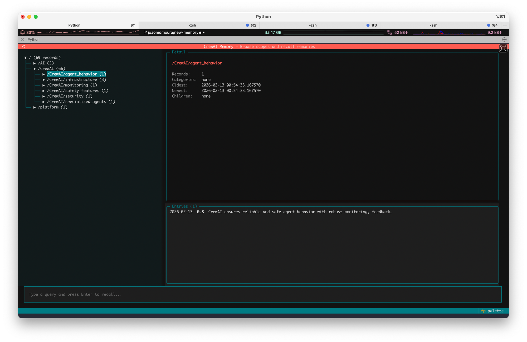 from crewai.memory import Memory # New Coginitive Memory Class memory = Memory() # Adding new memories directly memory.remember("We decided to use PostgreSQL for the user database.") # Recalling memories directly results = memory.recall("What database are we using?") # Extracting memorable facts from a string facts = memory.extract_memories("Long text with many possible facts") # Getting the memory tree memory.tree() # Forget certain memories from datetime import datetime, timedelta memory.forget(scope="/", older_than=datetime.utcnow() - timedelta(days=30))